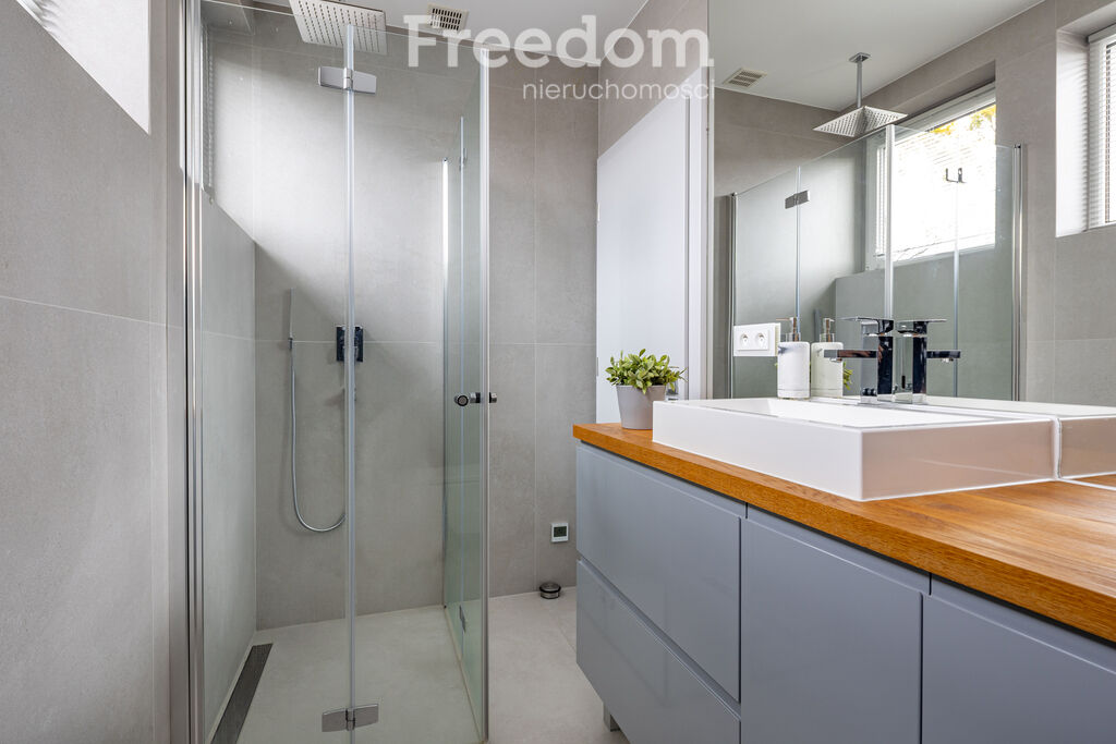 elegancką łazienkę wyposażoną w nowoczesną kabinę prysznicową.